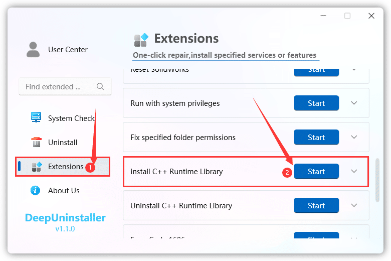 Click on “Extensions,” then click “Start” next to “Install C++ Runtime Library.”